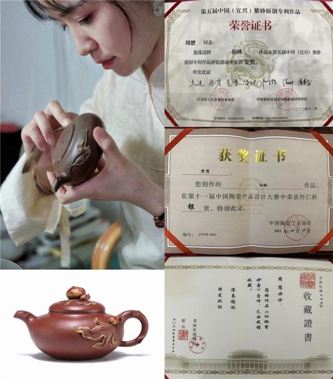 后在南京艺术学院的研究生学习经历让我获得了更广阔的视野。中西方艺术的交融让我认识到创新是必然,但越深入学习,越惊叹于东方古典元素蕴含的永恒魅力。这种认知直接体现在我的代表作《仙桃壶》中——以神话中的蟠桃为灵感,通过自然形态的艺术化表达,为传统紫砂注入鲜活的生命力,让使用者在品茗时既能感受艺术之美,又能体味吉祥寓意。我的代表作在第五届中国(宜兴)紫砂原创专利作品评比活动中荣获金奖、第十一届中国陶瓷产品设计大赛中荣获怀仁杯银奖,并且作品目前由青海省博物馆收藏。这段融合传统与现代的探索之路,让我更加坚定要以当代语言传承千年技艺,让紫砂艺术在新时代焕发独特光彩。